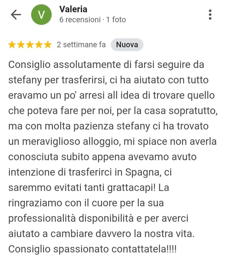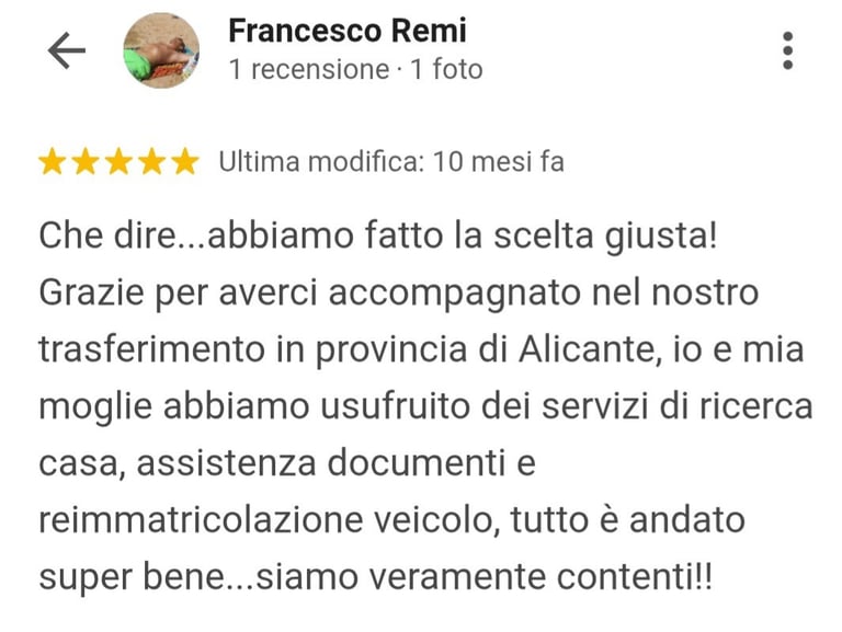 Dopo la firma del pre-contratto il servizio rimarrà a disposizione dei clienti fino alla firma del contratto definitivo e fino alla consegna delle chiavi di casa. Rimarremo a disposizione per rispondere ad eventuali domande o preoccupazioni che potrebbero sorgere e per fornire assistenza nella preparazione del trasferimento. Quando arriverete, vi accoglieremo sul posto e vi accompagneremo fino alla vostra abitazione. Avrete la possibilità di integrare i servizi supplementari finalizzati ad agevolare il vostro espatrio (Assistenza ottenimento NIE, trasferimento pensione, apertura conto bancario, assistenza ottenimento medico di base, reimmatricolazione auto), ed altri servizi personalizzati su richiesta.